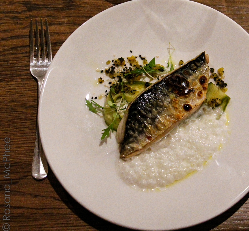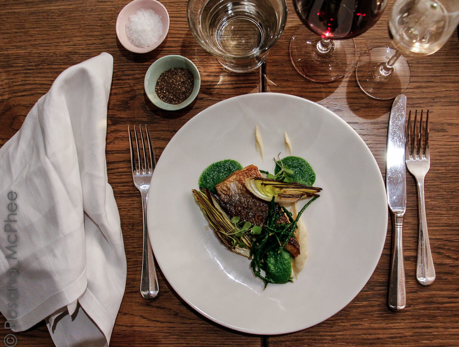 excellent fish dish: wild sea bream, blackend pudding, leeks, cauliflower purée,  samphire & kale foam