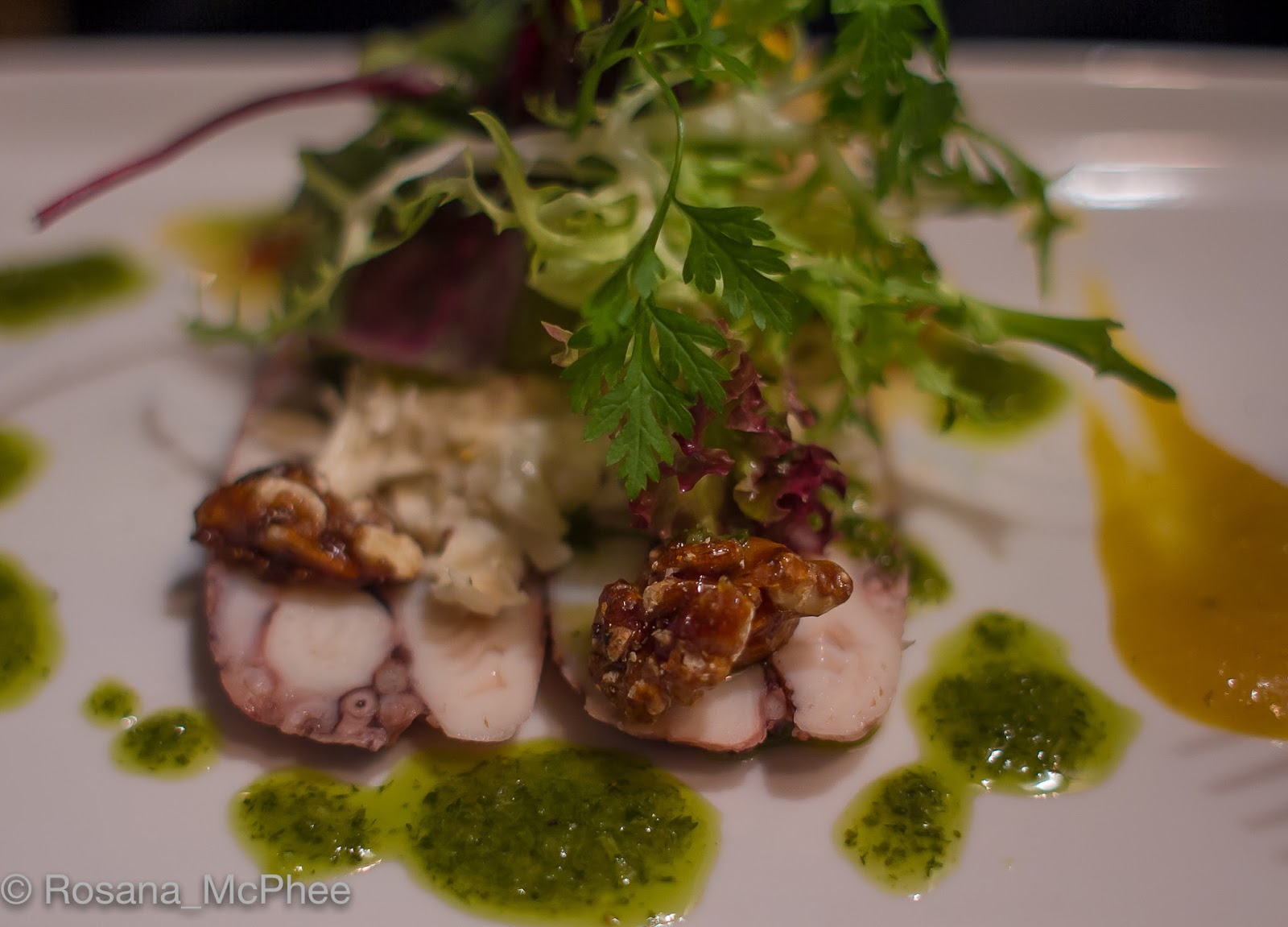 Carpaccio of Octopus, celeriac and walnut remoulade, Spiced Vodka lime and red pepper salsa