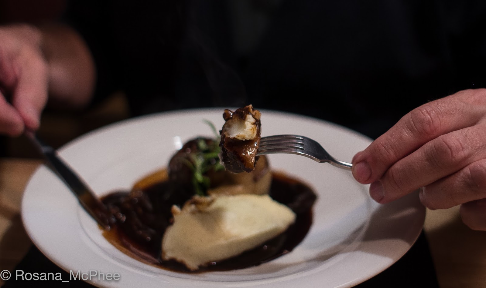 Steamed steak, kidney and ox cheek pudding, sticky black garlic and wild mushrooms