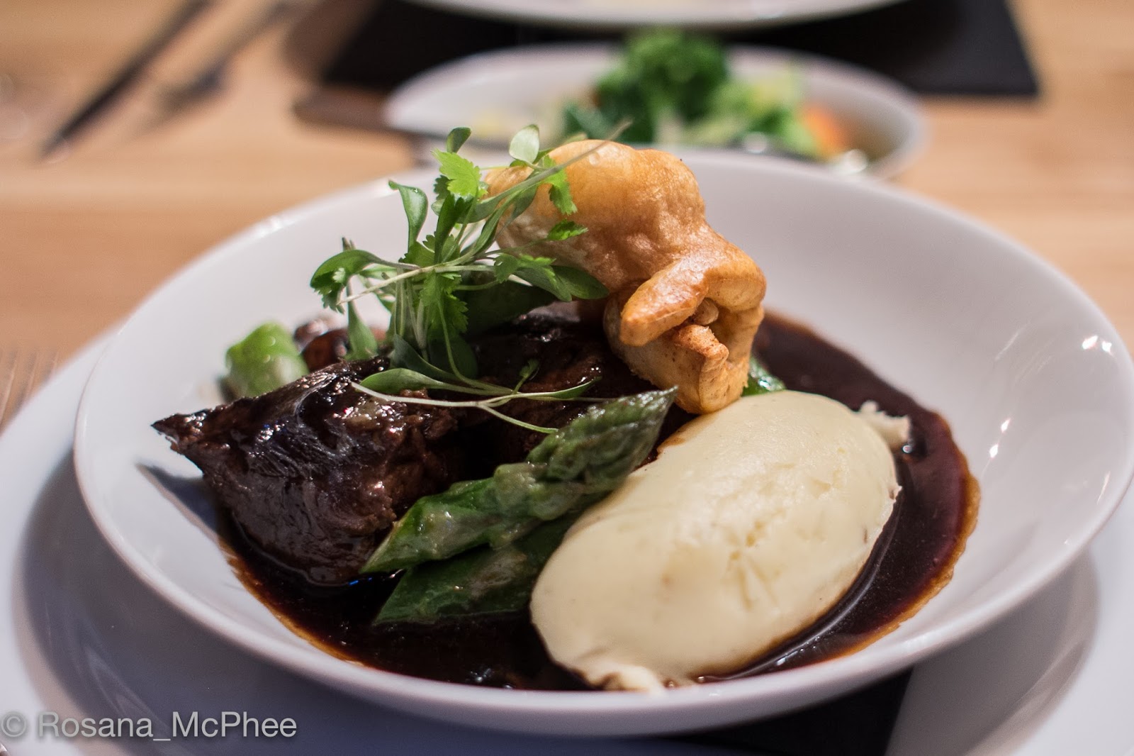 Braised Pigs Cheeks cooked in Ale with Creamed Potato and Asparagus