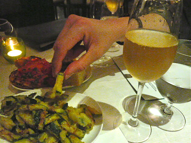 | Glass of bubbly, Zucchini Fritti and bruschetta alla Romana freshly made – I saw it being prepared! – |