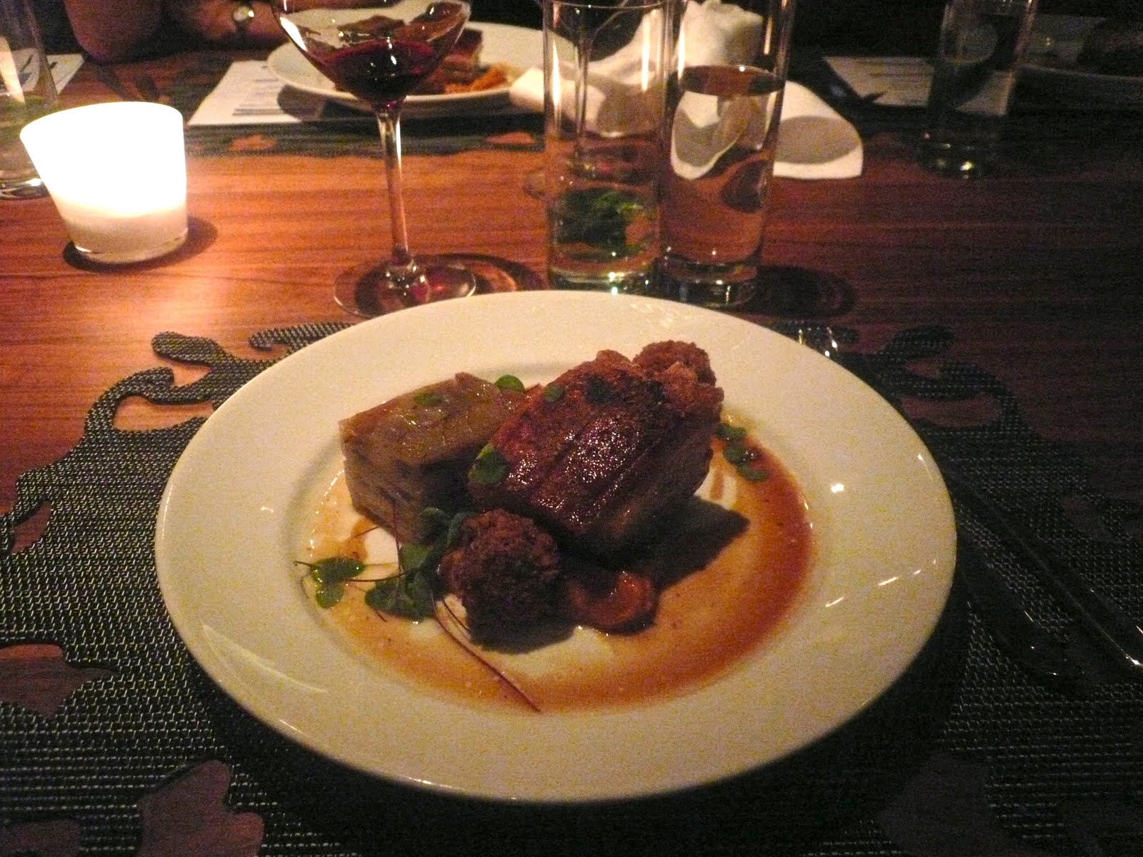 | Belly of pork, spiced stuffing, butternut squash puree, pomme Anna, apple jelly & coriander soy jus |